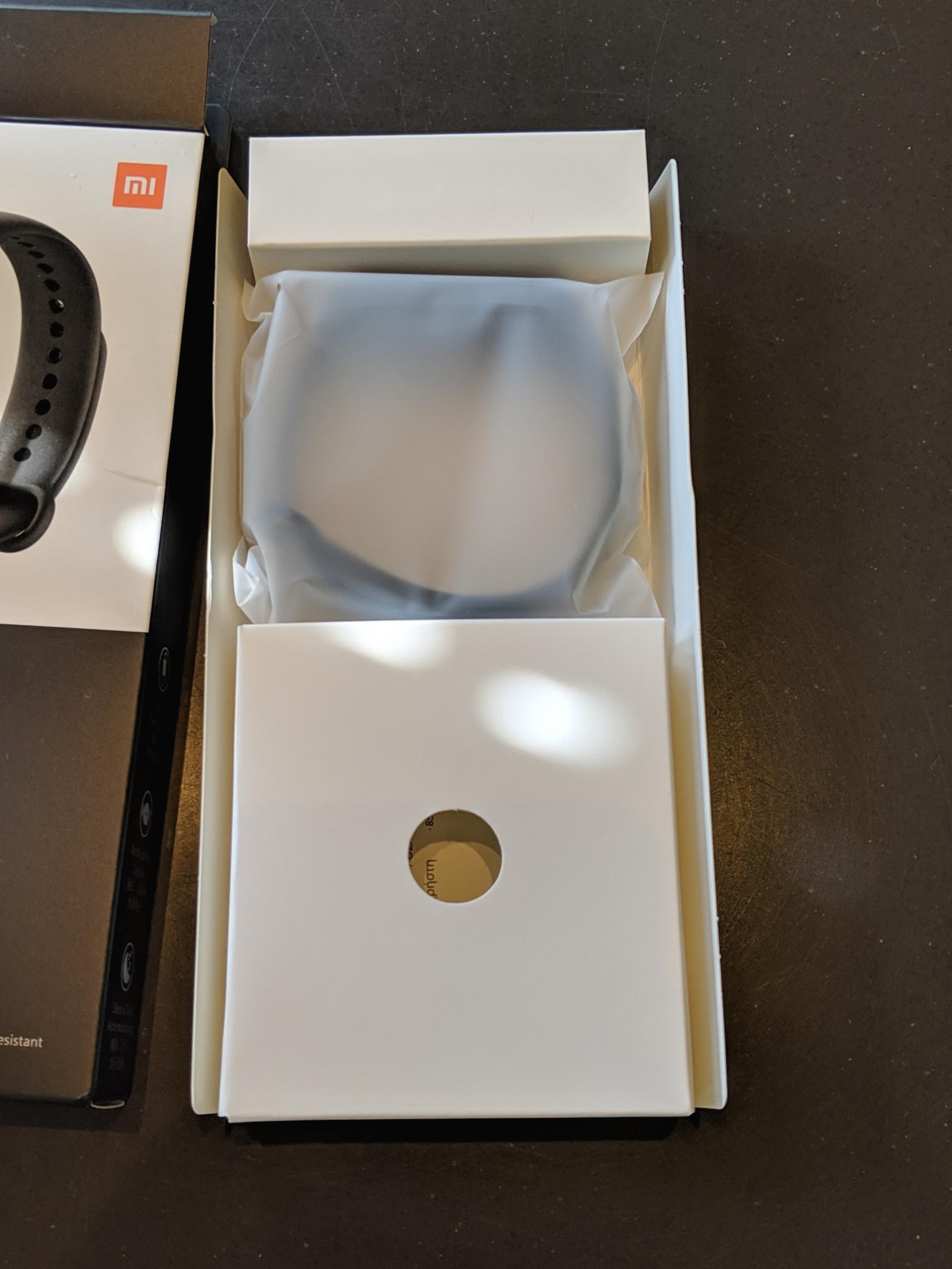구성으로, 윗자리는 충전기가 있고 중간에 밴드가 있다. 아래공간은 설명서.