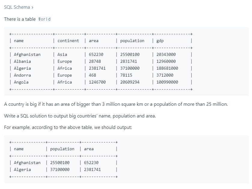 LeetCode #0595 BigCountries. Algorithm,알고리즘,LeetCode,Codefights,CodeSignal,코드파이트,코드시그널,예제,문제해결능력,example,c++,java,재귀,recursive,datastructure,techinterview,coding,코딩인터뷰,기술면접,연결리스트, Database, 데이터베이스, mysql, mssql, query