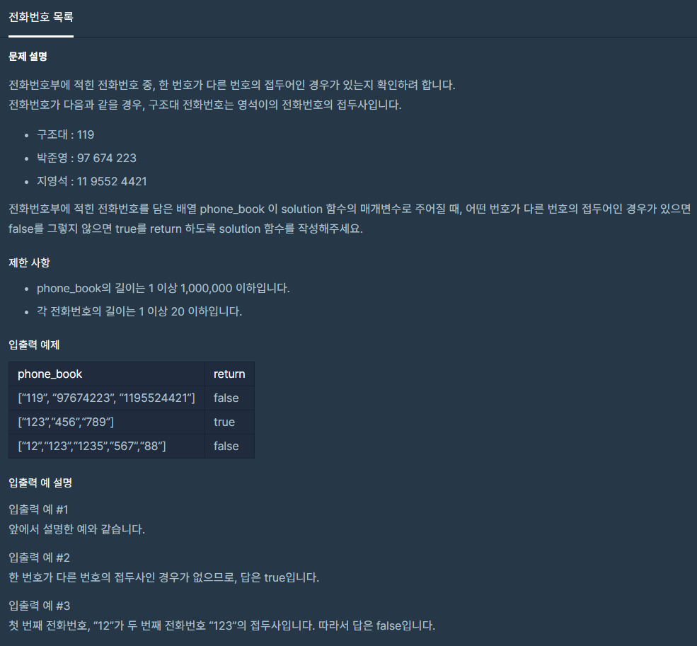 # 전화번호부에 적힌 전화번호를 담은 배열 phone_book 이 solution 함수의 매개변수로 주어질 때, 어떤 번호가 다른 번호의 접두어인 경우가 있으면 false를 그렇지 않으면 true를 return 하도록 solution 함수를 작성해주세요.