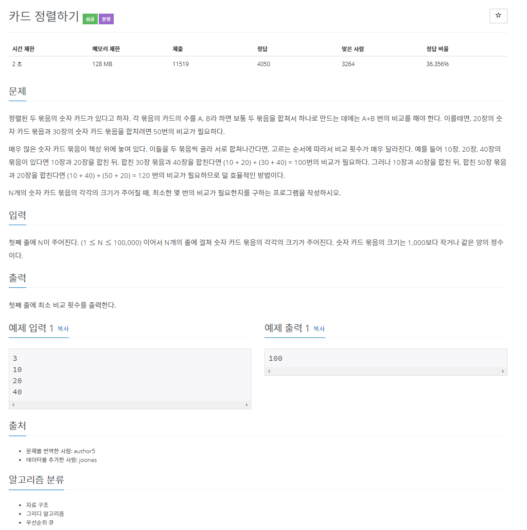 // 2. 각 카드묶음의 크기들을 입력 받을 때, 추후에 최소값을 찾기 쉽도록 우선순위 큐를 이용한다.