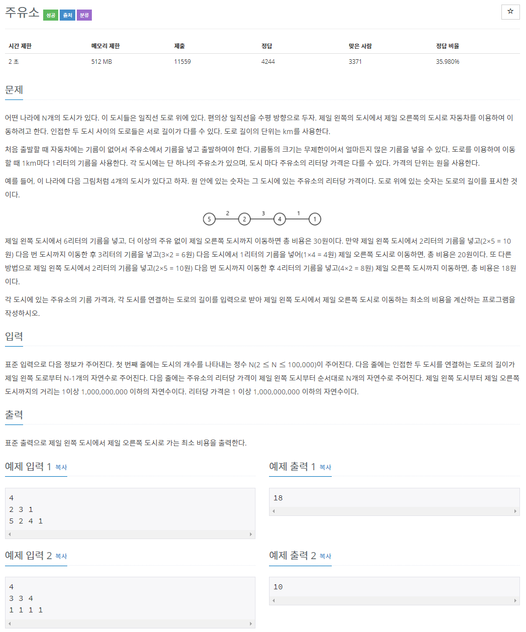 // 2.1. 현재있는 도시의 기름가격보다 싼 도시까지 가는 기름을 채운다.