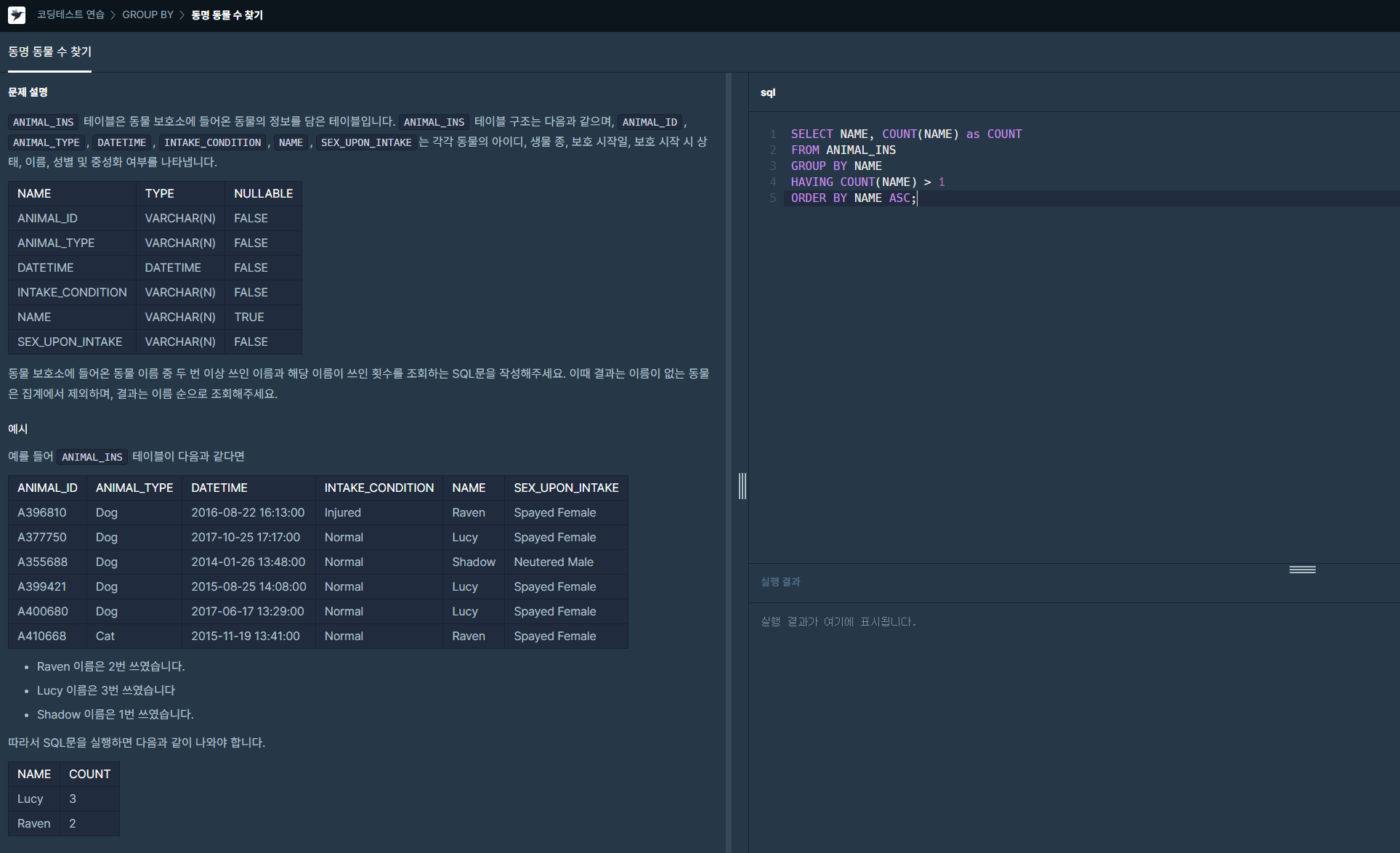 HAVING 그룹핑한 내용 중에서 보여줄 기준선