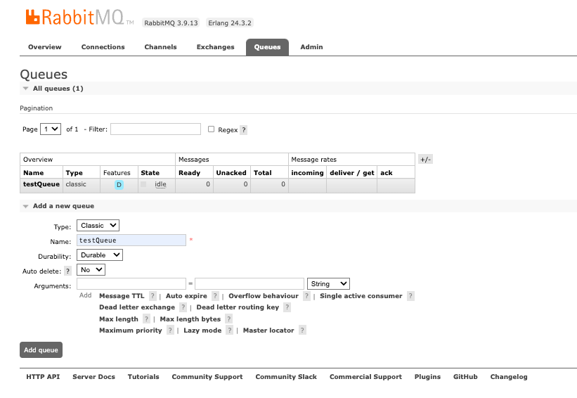 - RabbitMQ 에서 Queue 생성 (이름은 testQueue, 아래 그림 참조)