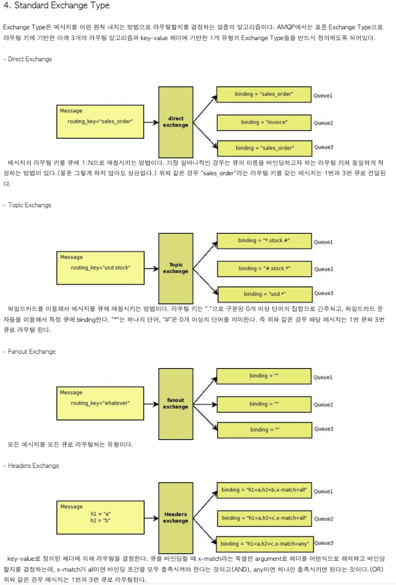- AMQP의 표준 Exchange type은 이 라우팅 키를 이용하도록 되어있다.