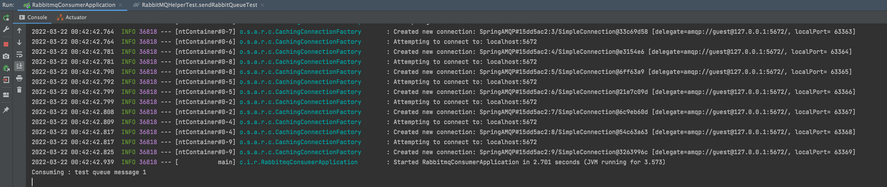 - IDE 에서 Producer 의 RabbitMQHelperTest 클래스 테스트메서드 실행해서 메시지 보내기